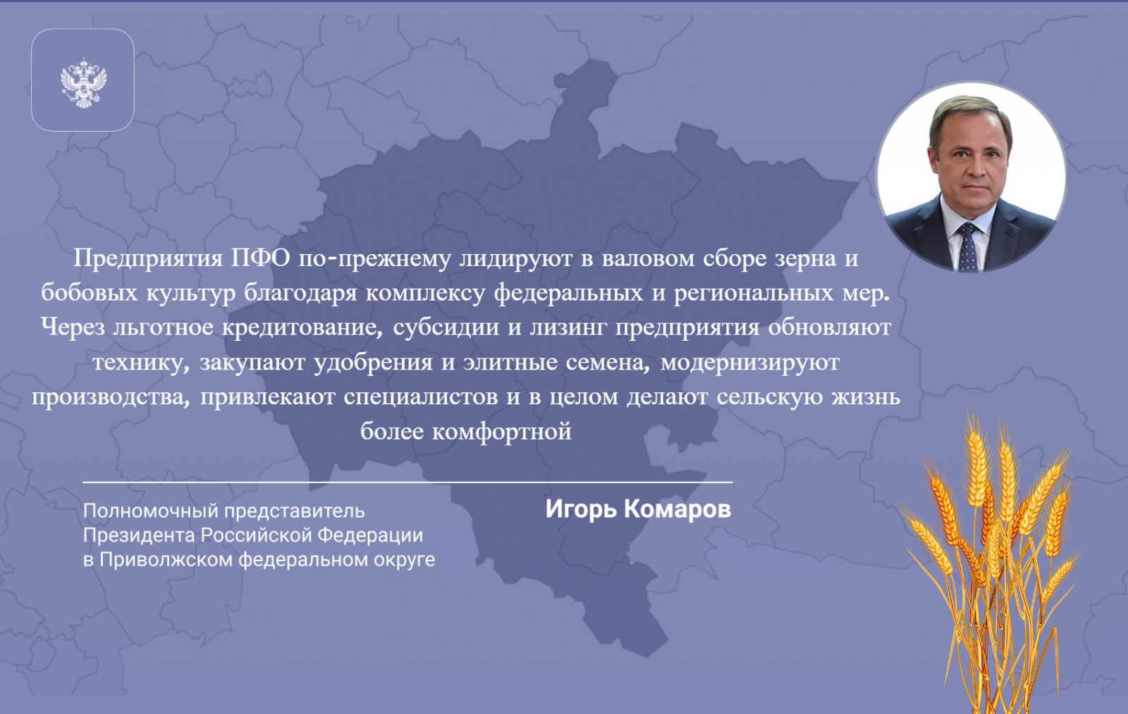 По мнению полномочного представителя Президента РФ в ПФО Игоря Комарова, уборочная кампания прошла успешно. «Предприятия ПФО по-прежнему лидируют в валовом сборе зерна и бобовых культур благодаря комплексу федеральных и региональных мер. Через льготное кредитование, субсидии и лизинг предприятия обновляют технику, закупают удобрения и элитные семена, модернизируют производства, привлекают специалистов и в целом делают сельскую жизнь более комфортной».
