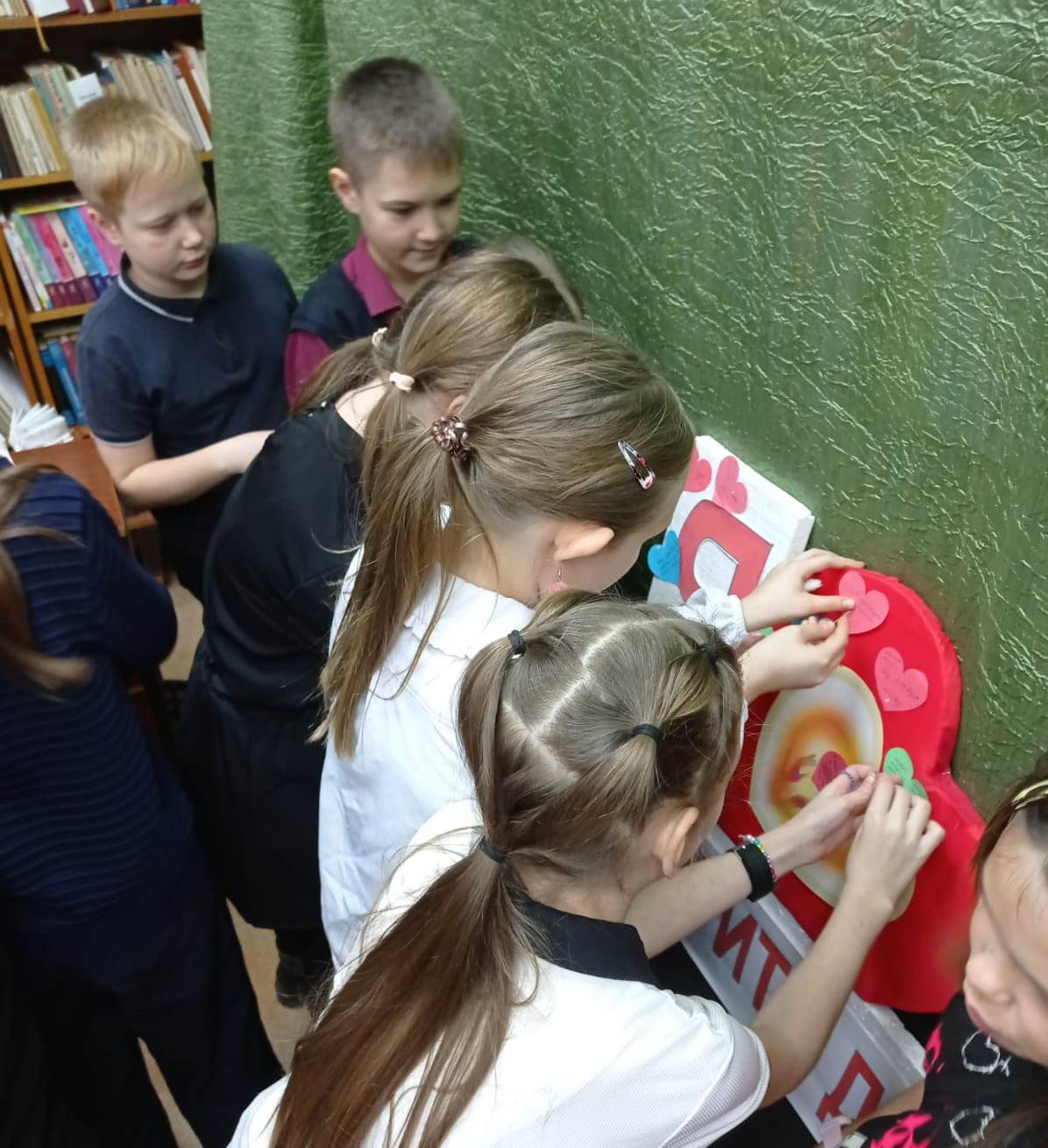 Библиотекарь Ершова А. В. познакомила ребят с историей возникновения дня доброты и с традициями праздника. Затем учащиеся посмотрели мультфильм и послушали притчу о старушке, которая собирала осколки стекла по морскому побережью. Ребята участвовали в играх «Настоящие друзья», «Найди пару», принимали участие в блиц-опросе «В гостях у сказки» и конкурсах «Говори хорошие слова», «Поле сказочных чудес». Вспоминали пословицы и поговорки о доброте, разбирались в ситуационных заданиях. В завершение урока доброты каждый участник написал на бумажном сердечке какой добрый поступок он совершил или обязательно совершит. И под песенку кота Леопольда ребята прикрепили свои сердечки на большое открытое сердце, которое является символом этого праздника.