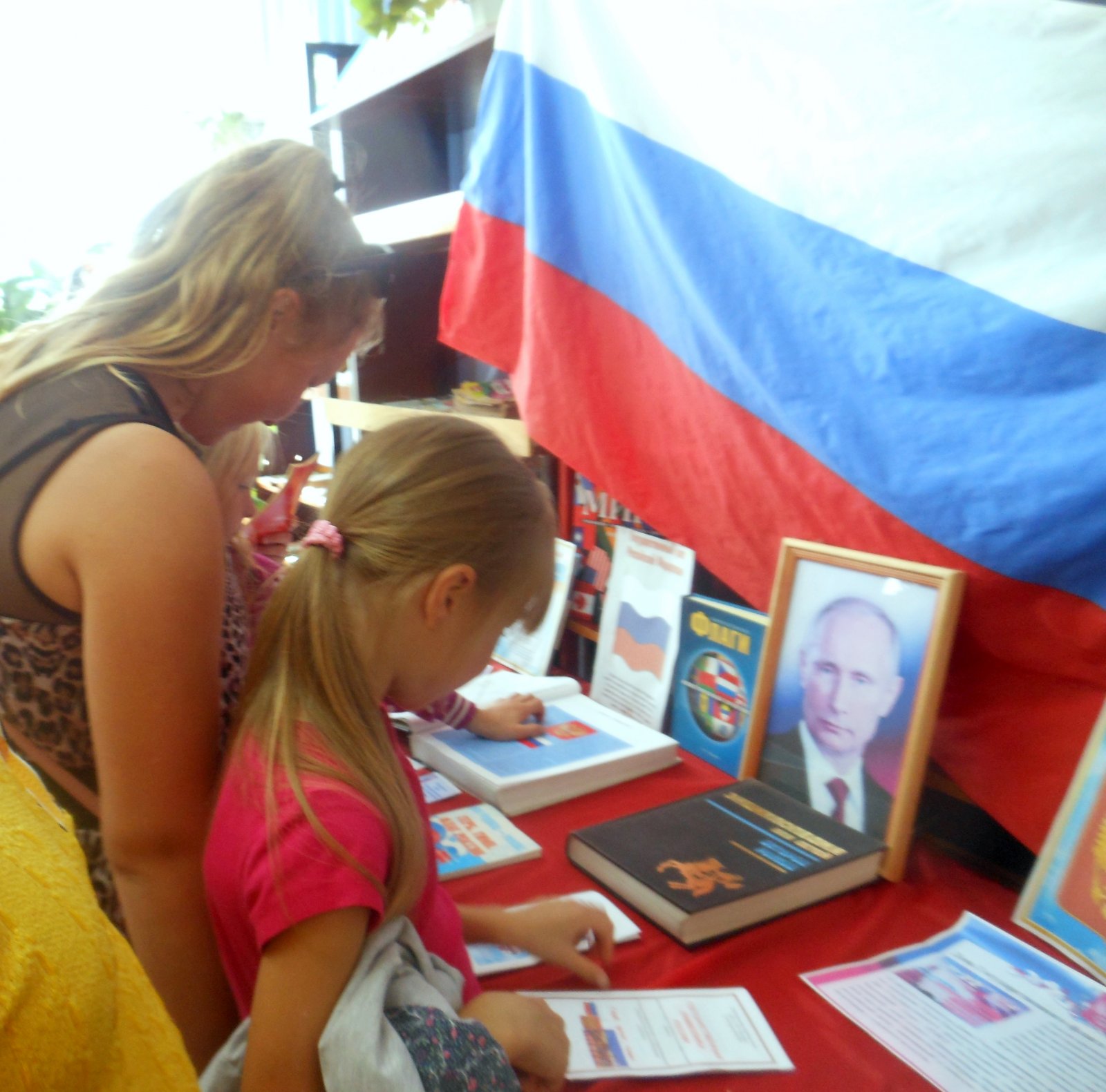 22 августа – День государственного флага Российской Федерации. Мероприятие, которое проходило в Центральной библиотеке с неорганизованными детьми, было посвящено этому празднику. Ведущая Л. Г. Беспалова рассказала ребятам об истории возникновения и утверждения флага, как одного из символов государства российского. Дети узнали о том, что в каждой стране существует триединство символов: герб, флаг, гимн. Далее была показана презентация «Флаги». К этому знаменательному событию в библиотеке была подготовлена выставка «Государственный флаг Российской Федерации», на которой разместились книги не только о российском флаге, но и о гимне и гербе. Юные читатели познакомились с буклетами, посвященными этой дате, изданными работниками библиотеки.