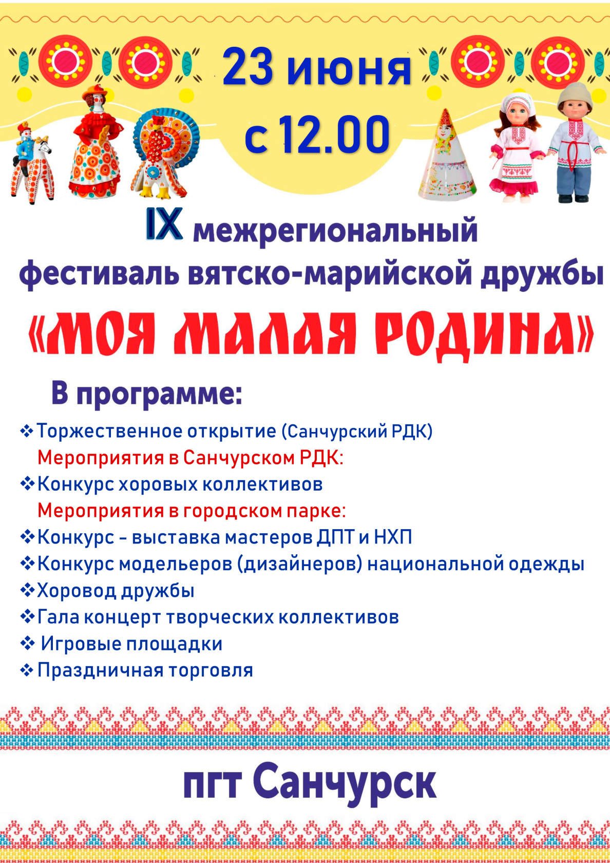 Санчурский РДК приглашает 23 июня в 12.00 жителей и гостей Санчурского района на Межрегиональный фестиваль вятско - марийской дружбы "Моя малая Родина"
