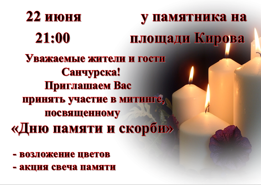 Администрация Санчурского района приглашает жителей и гостей района принять участие в митинге в День памяти и скорби 22 июня 2019 года в 21.00 на площади им. С.М.Кирова.