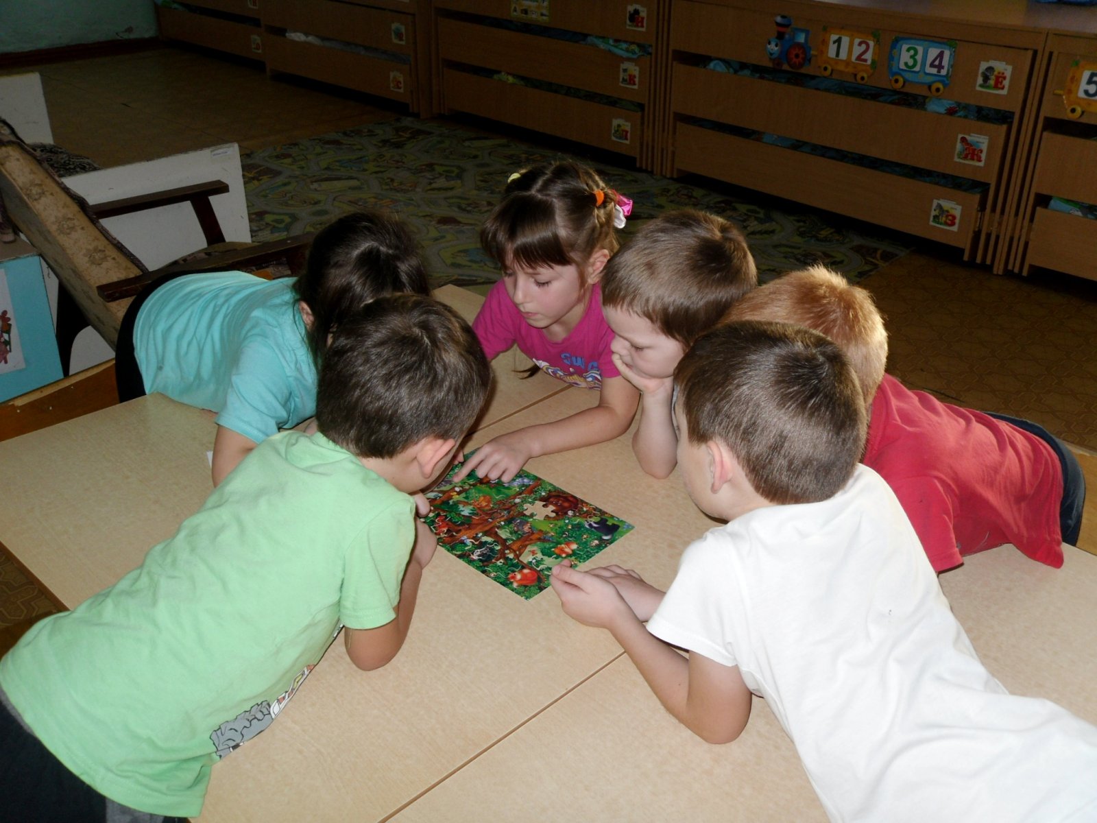 Дети с удовольствием собирали лесную картинку с животными, вставляя пазлы в пустые ячейки, а затем посмотрели мультфильм «Мальчик и лягушонок».