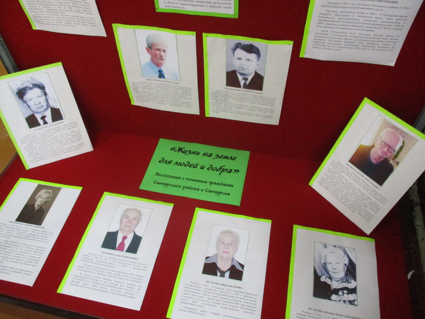 В Санчурском историческом музее оформлена экспозиция «Жизнь на земле для людей и добра» о почетных гражданах поселка и района - людях, внесших существенный личный вклад в социально-экономическое развитие края, его отраслей, науки, образования, охраны здоровья, местного самоуправления, отличившихся при защите Отечества, охране жизни и прав граждан, осуществлении благотворительной деятельности.