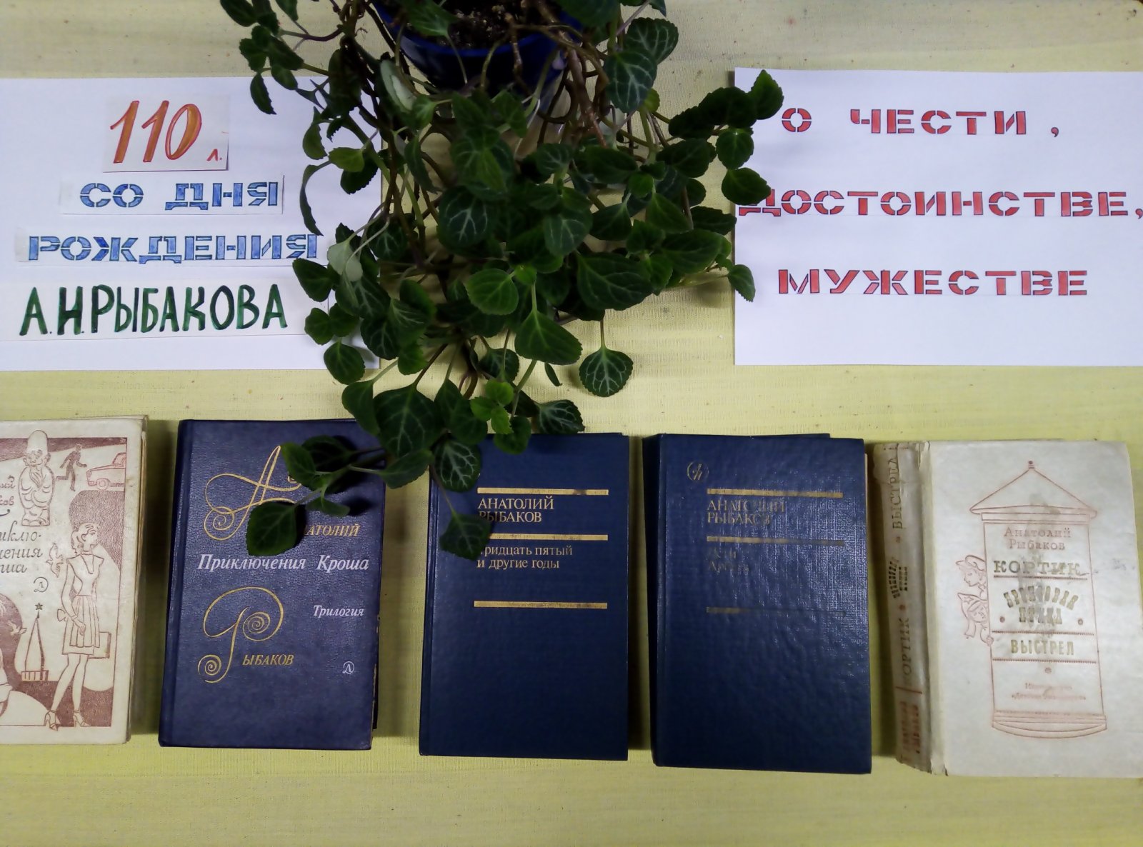 К 110-летию со дня рождения писателя А. Н. Рыбакова в Галицкой сельской библиотеке была оформлена книжная выставка. Произведения писателя широко известны и юному, и взрослому читателю. На выставке представлены увлекательные повести о веселых и опасных приключениях советских школьников и молодежи. Герои сами становятся следопытами и бойцами, борются со злом в любом обличии, защищают правду.