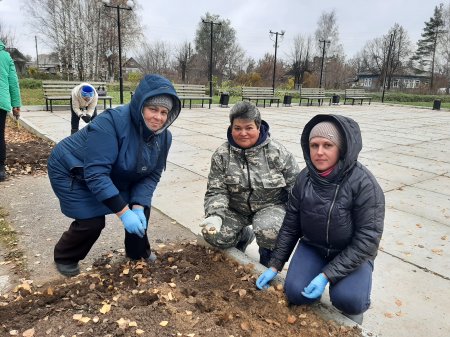 Работники центральной библиотеки им. А. М. Рыжова с детским отделом на клумбе возле памятника воинам-землякам посадили тюльпаны в память о павших воинах, защищавших нашу Родину от фашистских захватчиков!