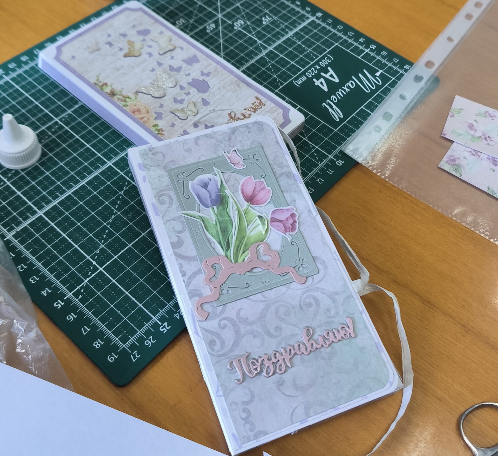 Работы получились невероятно нежными: пастельные тона, кружево, цветы и бантики. Каждая участница вложила в свою открытку частичку весеннего настроения.