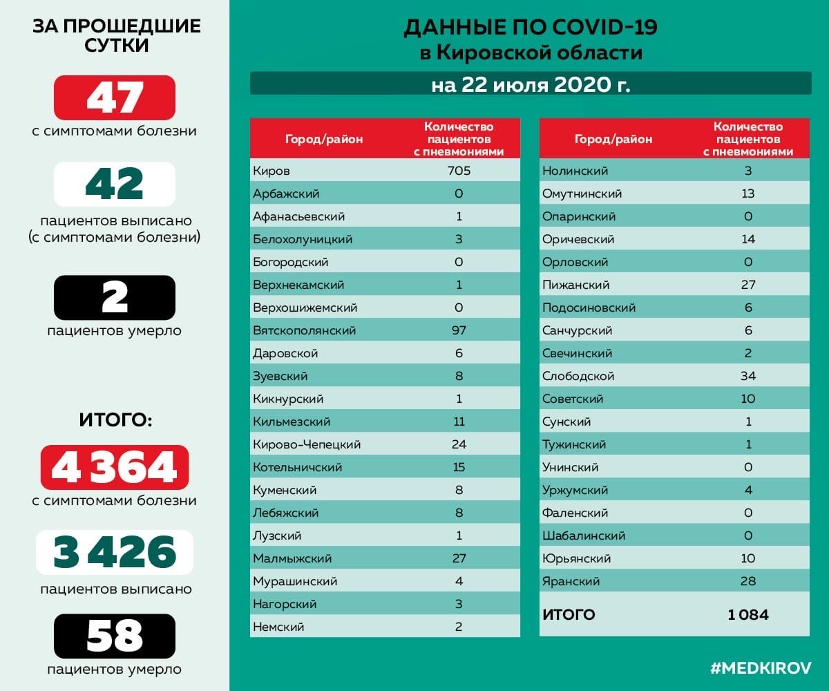 Количество пациентов с COVID-19, протекающим с симптомами вирусной пневмонии, по районам Кировской области на 22.07.2020